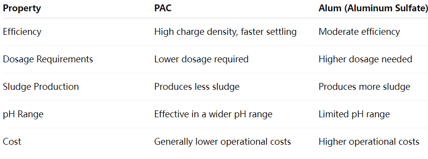 PAC lebih berkesan pada dos yang lebih rendah daripada alum, mengurangkan penggunaan kimia dan kos operasi di loji rawatan. Ini amat bermanfaat dalam merawat air dengan kekeruhan yang tinggi atau kandungan organik.